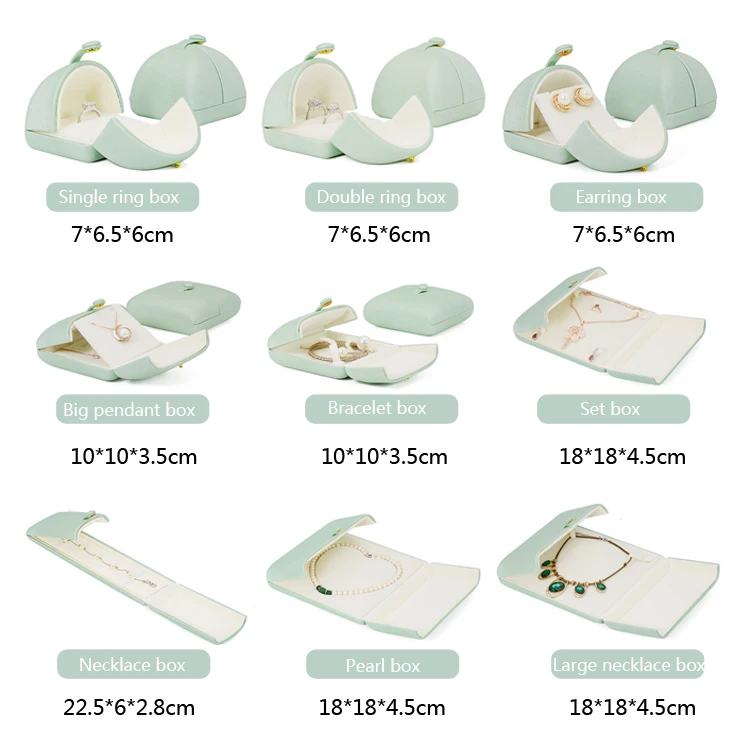 Size(D*H): Single ring box:7*6.5*6cm Double ring box:7*6.5*6cm Earring box:7*6.5*6cm Big pendant box:10*10*3.5cm Bracelet box:10*10*3.5cm Necklace box:22.5*6*2.8cm Set box:18*18*4.5cm Pearl box:18*18*4.5cm Large necklace box:18*18*4.5cm |