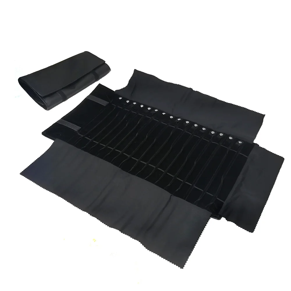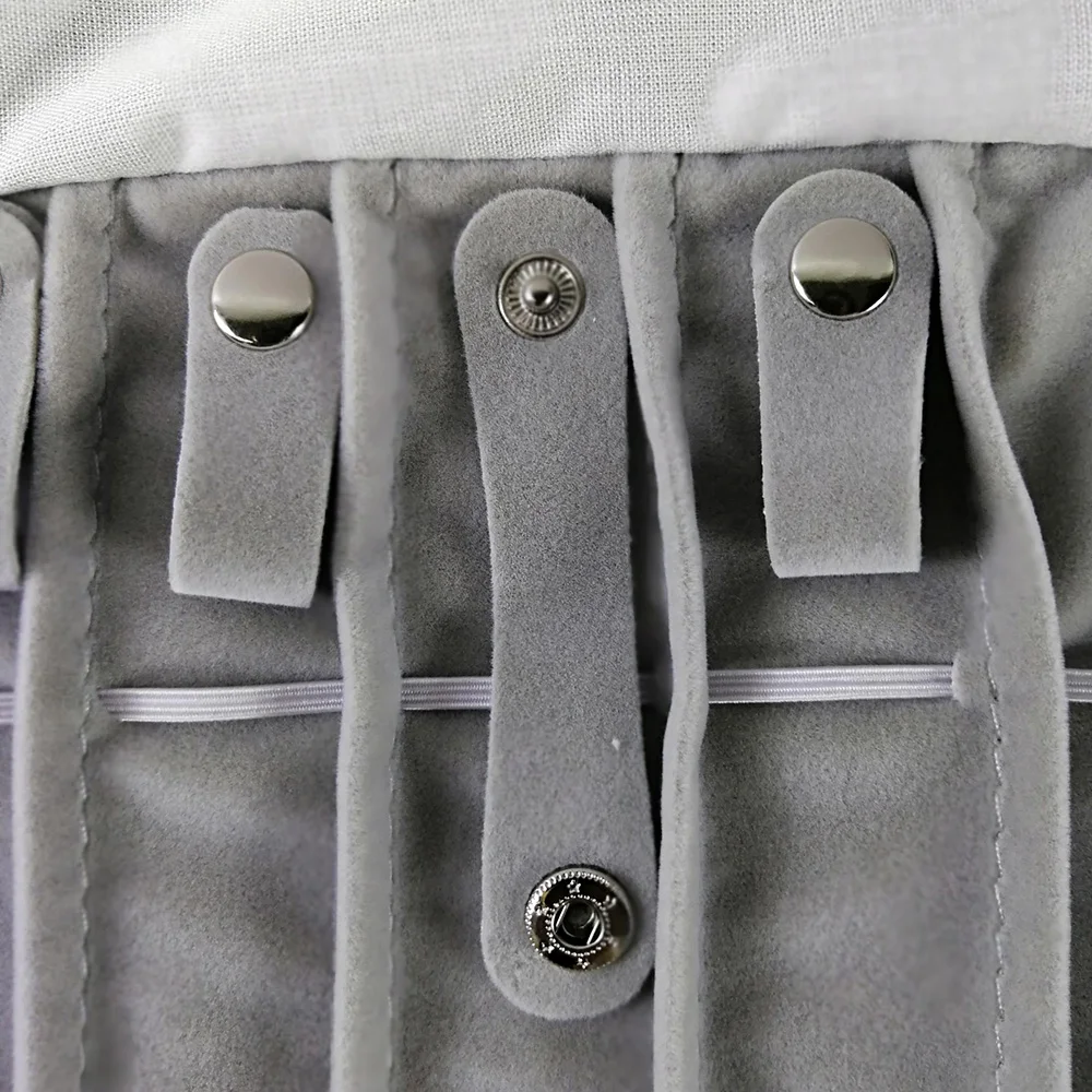2. There are 16 necklace spaces in the roll bag, each necklace is secured by the snap button.