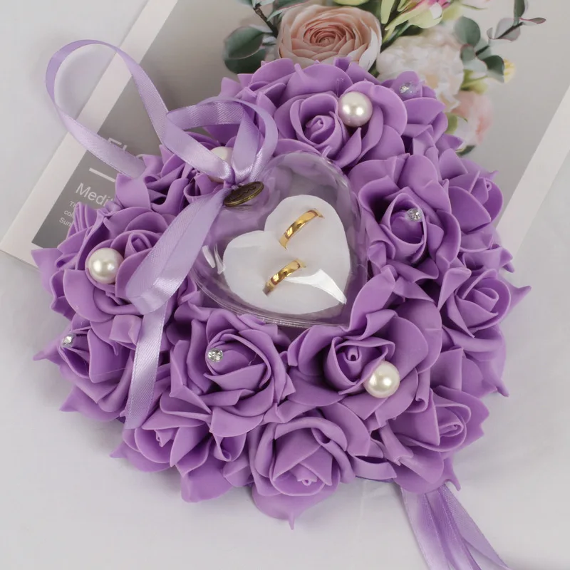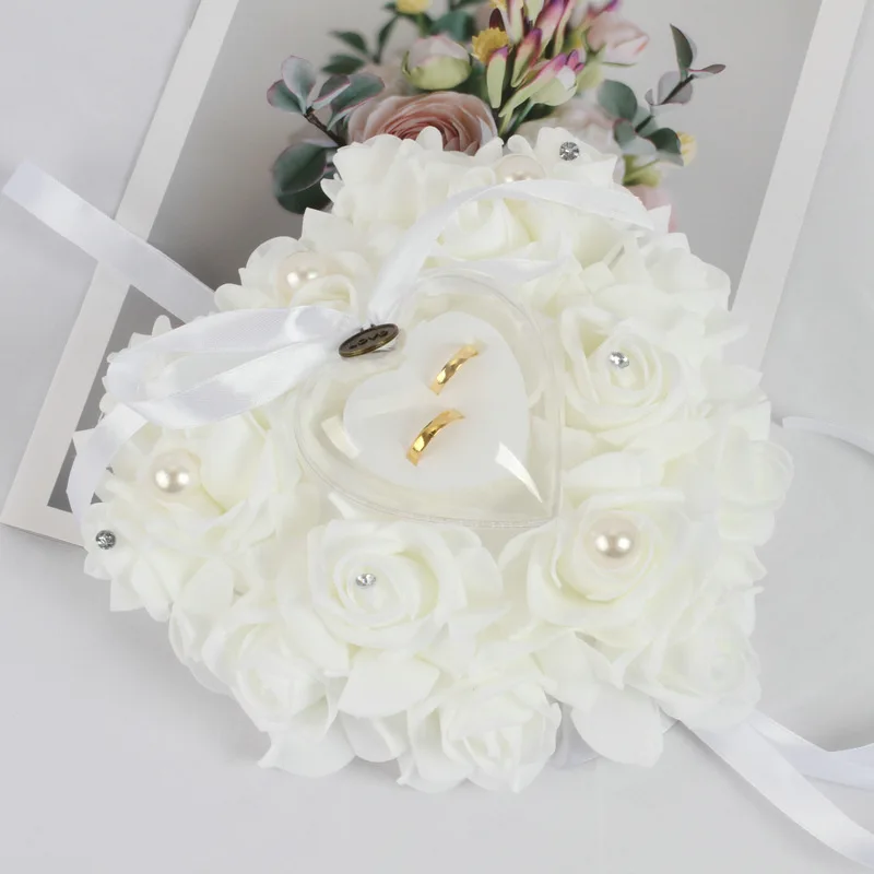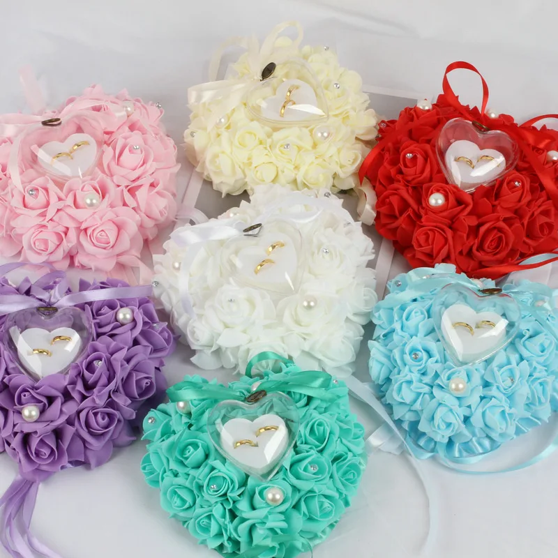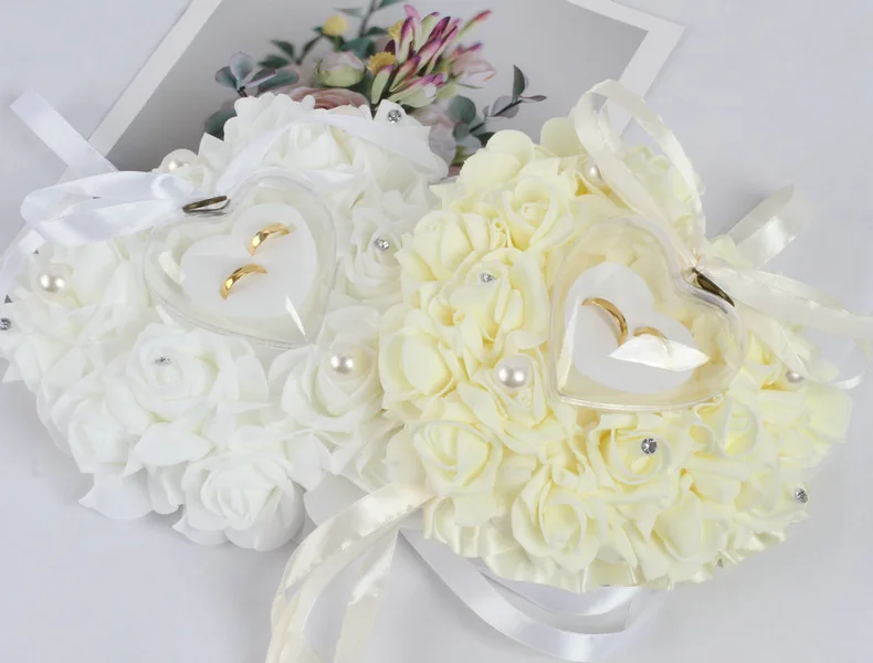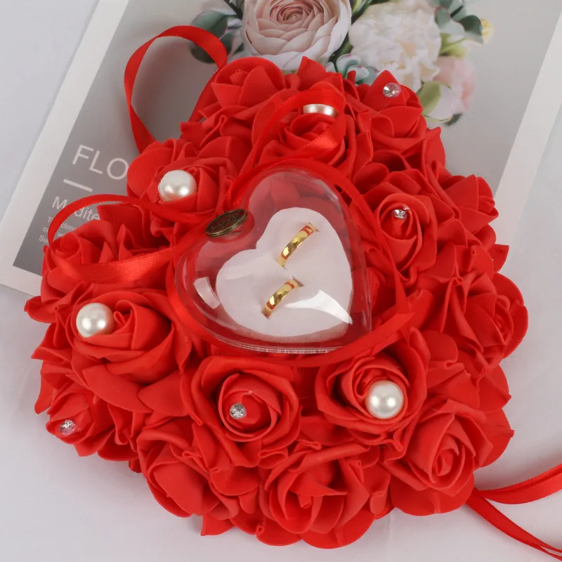 Weeding Couple Rings Holder Sweet Valentine Day Gift Heart Shape Ring Pillow Cushion Simulation Rose Flowers Jewelry Case